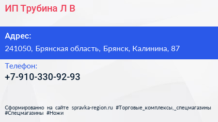 ИП Трубина Л.В. по адресу 241050, Брянская область, Брянск, Калинина, 87 в дальнейшем Организация, размещена в следующих категориях:
