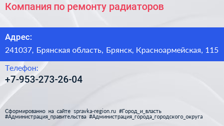 Компания по ремонту радиаторов по адресу 241037, Брянская область, Брянск, Красноармейская, 115 в дальнейшем Организация, размещена в следующих категориях: