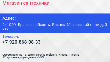 Магазин сантехники по адресу 241020, Брянская область, Брянск, Московский проезд, 3 ст3 в дальнейшем Организация, размещена в следующих категориях: