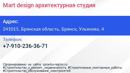 Mart design, архитектурная студия по адресу 241015, Брянская область, Брянск, Ульянова, 4 в дальнейшем Организация, размещена в следующих категориях: