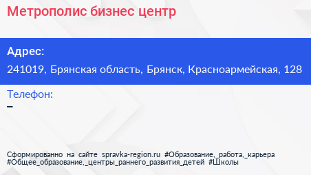 Метрополис, бизнес-центр по адресу 241019, Брянская область, Брянск, Красноармейская, 128 в дальнейшем Организация, размещена в следующих категориях: