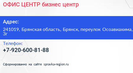 ОФИС-ЦЕНТР, бизнес-центр по адресу 241019, Брянская область, Брянск, переулок Осоавиахима, 3г в дальнейшем Организация, размещена в следующих категориях: