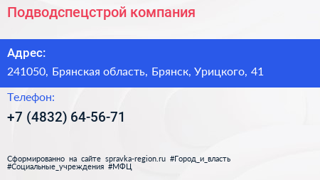 Подводспецстрой, компания по адресу 241050, Брянская область, Брянск, Урицкого, 41 в дальнейшем Организация, размещена в следующих категориях: