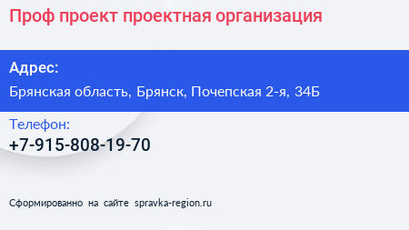 Проф-проект, проектная организация по адресу Брянская область, Брянск, Почепская 2-я, 34Б в дальнейшем Организация, размещена в следующих категориях: