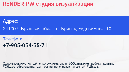 RENDER.PW, студия визуализации по адресу 241007, Брянская область, Брянск, Евдокимова, 10 в дальнейшем Организация, размещена в следующих категориях: