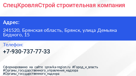 СпецКровляСтрой, строительная компания по адресу 241520, Брянская область, Брянск, улица Демьяна Бедного, 15 в дальнейшем Организация, размещена в следующих категориях: