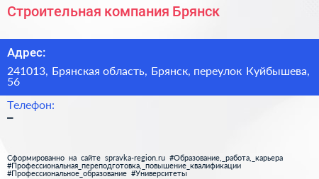 Строительная компания-Брянск по адресу 241013, Брянская область, Брянск, переулок Куйбышева, 56 в дальнейшем Организация, размещена в следующих категориях: