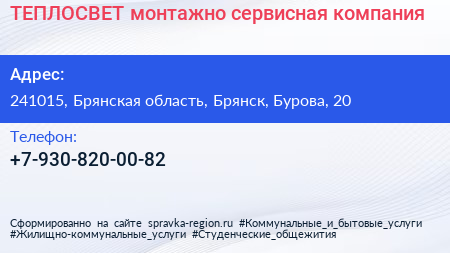 ТЕПЛОСВЕТ, монтажно-сервисная компания по адресу 241015, Брянская область, Брянск, Бурова, 20 в дальнейшем Организация, размещена в следующих категориях: