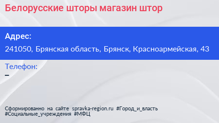 Белорусские шторы, магазин штор по адресу 241050, Брянская область, Брянск, Красноармейская, 43 в дальнейшем Организация, размещена в следующих категориях: