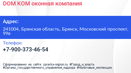 DOM KOM, оконная компания по адресу 241004, Брянская область, Брянск, Московский проспект, 99в в дальнейшем Организация, размещена в следующих категориях: