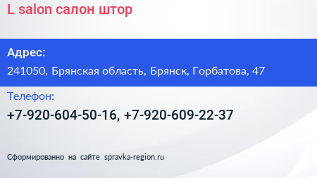 L salon, салон штор по адресу 241050, Брянская область, Брянск, Горбатова, 47 в дальнейшем Организация, размещена в следующих категориях: