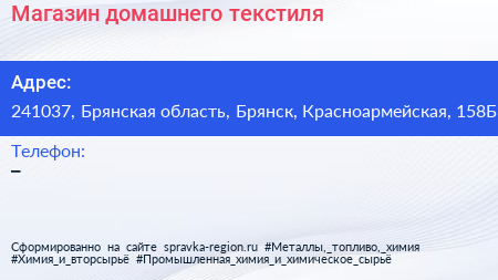 Магазин домашнего текстиля по адресу 241037, Брянская область, Брянск, Красноармейская, 158Б в дальнейшем Организация, размещена в следующих категориях: