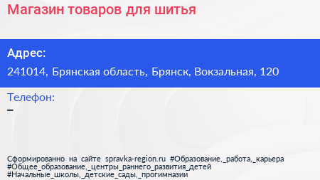 Магазин товаров для шитья по адресу 241014, Брянская область, Брянск, Вокзальная, 120 в дальнейшем Организация, размещена в следующих категориях: