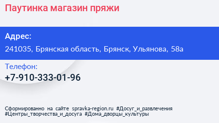 Паутинка, магазин пряжи по адресу 241035, Брянская область, Брянск, Ульянова, 58а в дальнейшем Организация, размещена в следующих категориях: