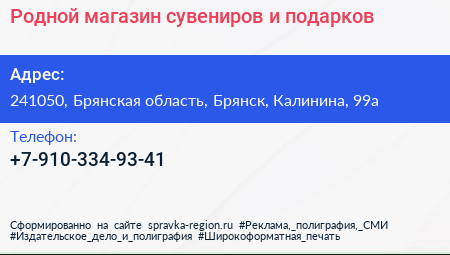 Родной, магазин сувениров и подарков по адресу 241050, Брянская область, Брянск, Калинина, 99а в дальнейшем Организация, размещена в следующих категориях: