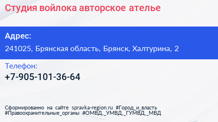 Студия войлока, авторское ателье по адресу 241025, Брянская область, Брянск, Халтурина, 2 в дальнейшем Организация, размещена в следующих категориях: