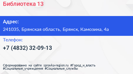 Библиотека №13 по адресу 241035, Брянская область, Брянск, Камозина, 4а в дальнейшем Организация, размещена в следующих категориях: