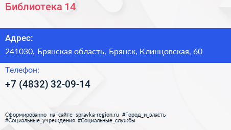 Библиотека №14 по адресу 241030, Брянская область, Брянск, Клинцовская, 60 в дальнейшем Организация, размещена в следующих категориях:
