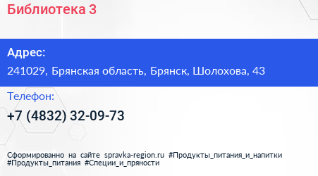 Библиотека №3 по адресу 241029, Брянская область, Брянск, Шолохова, 43 в дальнейшем Организация, размещена в следующих категориях:
