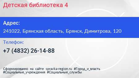 Детская библиотека №4 по адресу 241022, Брянская область, Брянск, Димитрова, 120 в дальнейшем Организация, размещена в следующих категориях: