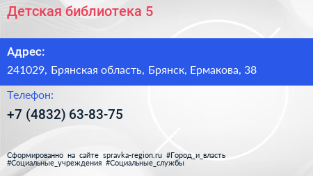 Детская библиотека №5 по адресу 241029, Брянская область, Брянск, Ермакова, 38 в дальнейшем Организация, размещена в следующих категориях: