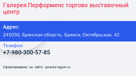 Галерея Перформенс, торгово-выставочный центр по адресу 241050, Брянская область, Брянск, Октябрьская, 42 в дальнейшем Организация, размещена в следующих категориях: