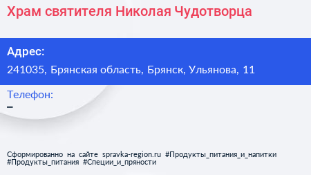 Храм святителя Николая Чудотворца по адресу 241035, Брянская область, Брянск, Ульянова, 11 в дальнейшем Организация, размещена в следующих категориях: