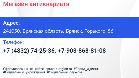 Магазин антиквариата по адресу 241050, Брянская область, Брянск, Горького, 56 в дальнейшем Организация, размещена в следующих категориях: