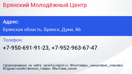 Брянский Молодёжный Центр по адресу Брянская область, Брянск, Дуки, 86 в дальнейшем Организация, размещена в следующих категориях: