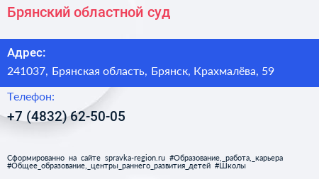 Брянский областной суд по адресу 241037, Брянская область, Брянск, Крахмалёва, 59 в дальнейшем Организация, размещена в следующих категориях:
