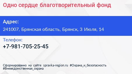 Одно сердце, благотворительный фонд по адресу 241007, Брянская область, Брянск, 3 Июля, 14 в дальнейшем Организация, размещена в следующих категориях: