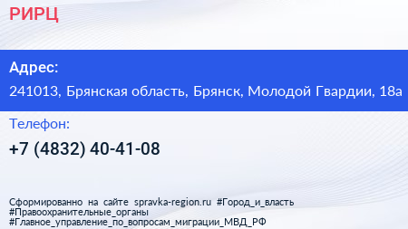 РИРЦ по адресу 241013, Брянская область, Брянск, Молодой Гвардии, 18а в дальнейшем Организация, размещена в следующих категориях: