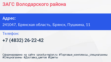 ЗАГС Володарского района по адресу 241047, Брянская область, Брянск, Пушкина, 11 в дальнейшем Организация, размещена в следующих категориях: