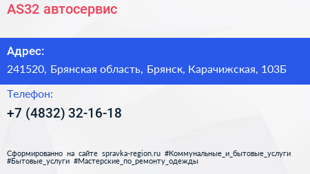 AS32, автосервис по адресу 241520, Брянская область, Брянск, Карачижская, 103Б в дальнейшем Организация, размещена в следующих категориях: