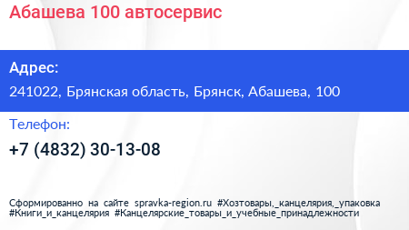 Абашева 100, автосервис по адресу 241022, Брянская область, Брянск, Абашева, 100 в дальнейшем Организация, размещена в следующих категориях: