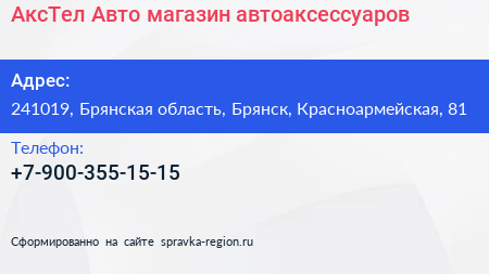 АксТел Авто, магазин автоаксессуаров по адресу 241019, Брянская область, Брянск, Красноармейская, 81 в дальнейшем Организация, размещена в следующих категориях: