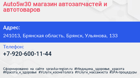 Auto5w30, магазин автозапчастей и автотоваров по адресу 241013, Брянская область, Брянск, Ульянова, 133 в дальнейшем Организация, размещена в следующих категориях: