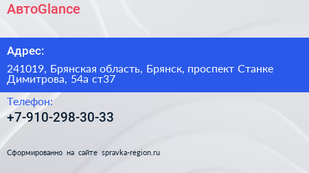 АвтоGlancе по адресу 241019, Брянская область, Брянск, проспект Станке Димитрова, 54а ст37 в дальнейшем Организация, размещена в следующих категориях: