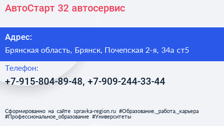АвтоСтарт 32, автосервис по адресу Брянская область, Брянск, Почепская 2-я, 34а ст5 в дальнейшем Организация, размещена в следующих категориях: