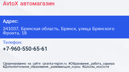 AvtoX, автомагазин по адресу 241037, Брянская область, Брянск, улица Брянского Фронта, 18 в дальнейшем Организация, размещена в следующих категориях: