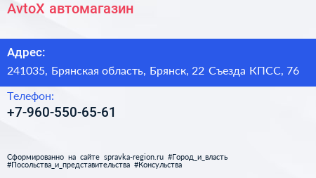 AvtoX, автомагазин по адресу 241035, Брянская область, Брянск, 22 Съезда КПСС, 76 в дальнейшем Организация, размещена в следующих категориях: