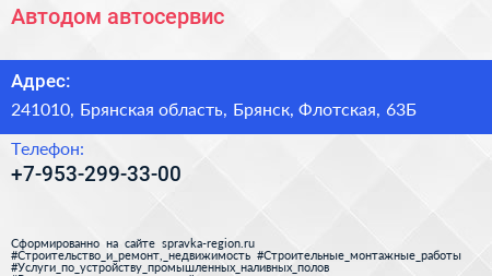 Автодом, автосервис по адресу 241010, Брянская область, Брянск, Флотская, 63Б в дальнейшем Организация, размещена в следующих категориях: