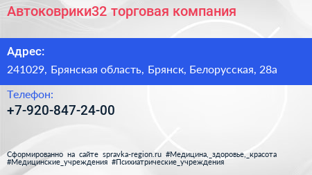 Автоковрики32, торговая компания по адресу 241029, Брянская область, Брянск, Белорусская, 28а в дальнейшем Организация, размещена в следующих категориях: