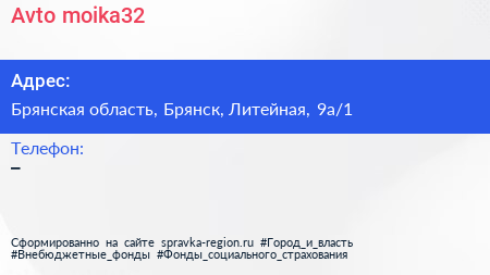 Avto.moika32 по адресу Брянская область, Брянск, Литейная, 9а/1 в дальнейшем Организация, размещена в следующих категориях: