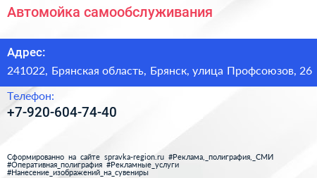 Автомойка самообслуживания по адресу 241022, Брянская область, Брянск, улица Профсоюзов, 26 в дальнейшем Организация, размещена в следующих категориях: