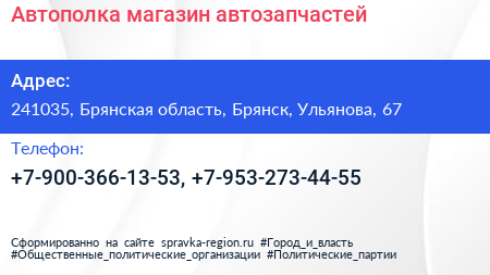 Автополка, магазин автозапчастей по адресу 241035, Брянская область, Брянск, Ульянова, 67 в дальнейшем Организация, размещена в следующих категориях: