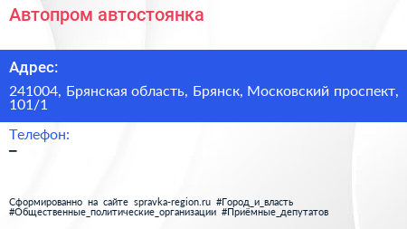 Автопром, автостоянка по адресу 241004, Брянская область, Брянск, Московский проспект, 101/1 в дальнейшем Организация, размещена в следующих категориях:
