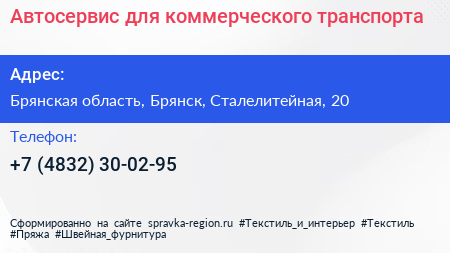 Автосервис для коммерческого транспорта по адресу Брянская область, Брянск, Сталелитейная, 20 в дальнейшем Организация, размещена в следующих категориях:
