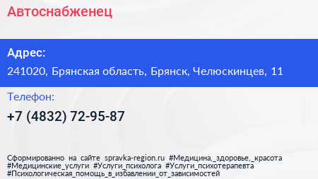 Автоснабженец по адресу 241020, Брянская область, Брянск, Челюскинцев, 11 в дальнейшем Организация, размещена в следующих категориях: