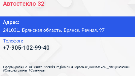 Автостекло 32 по адресу 241031, Брянская область, Брянск, Речная, 97 в дальнейшем Организация, размещена в следующих категориях: